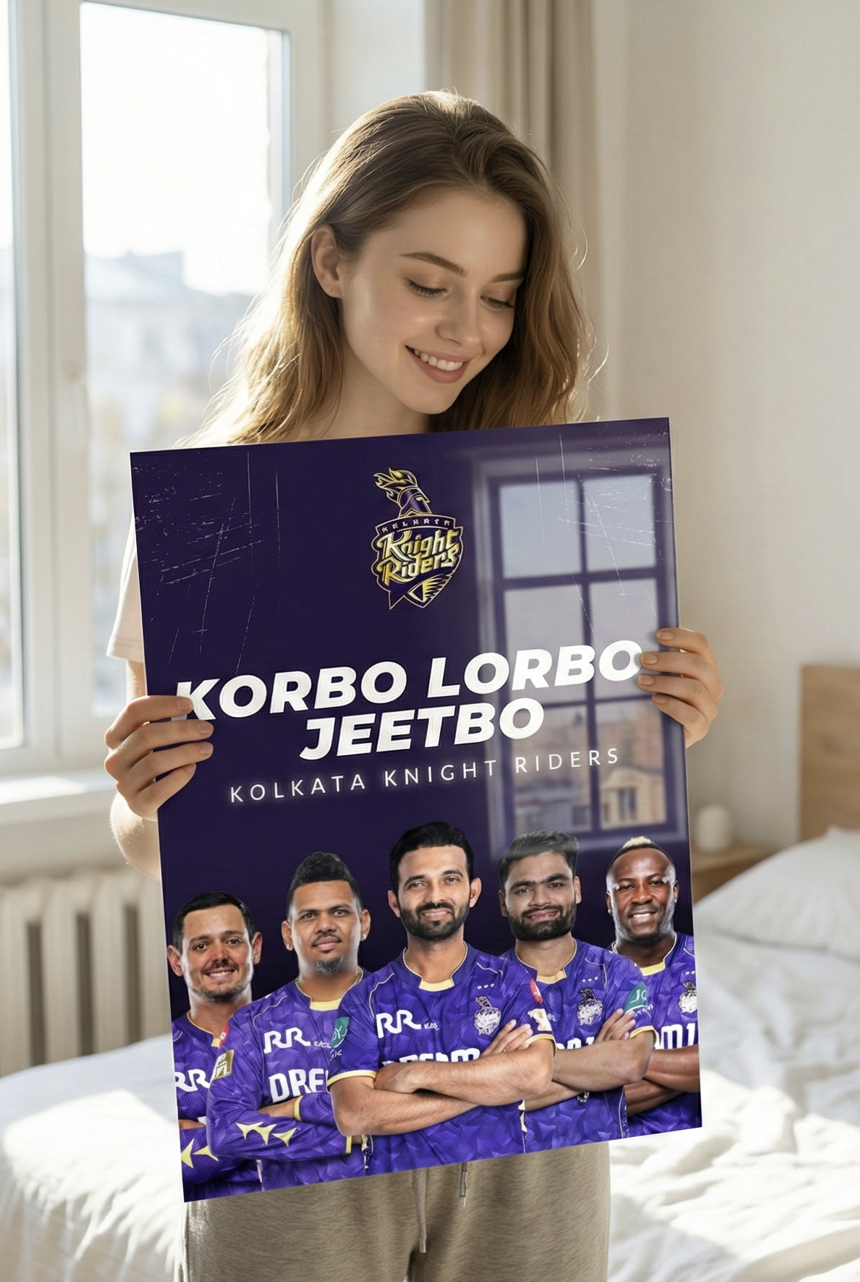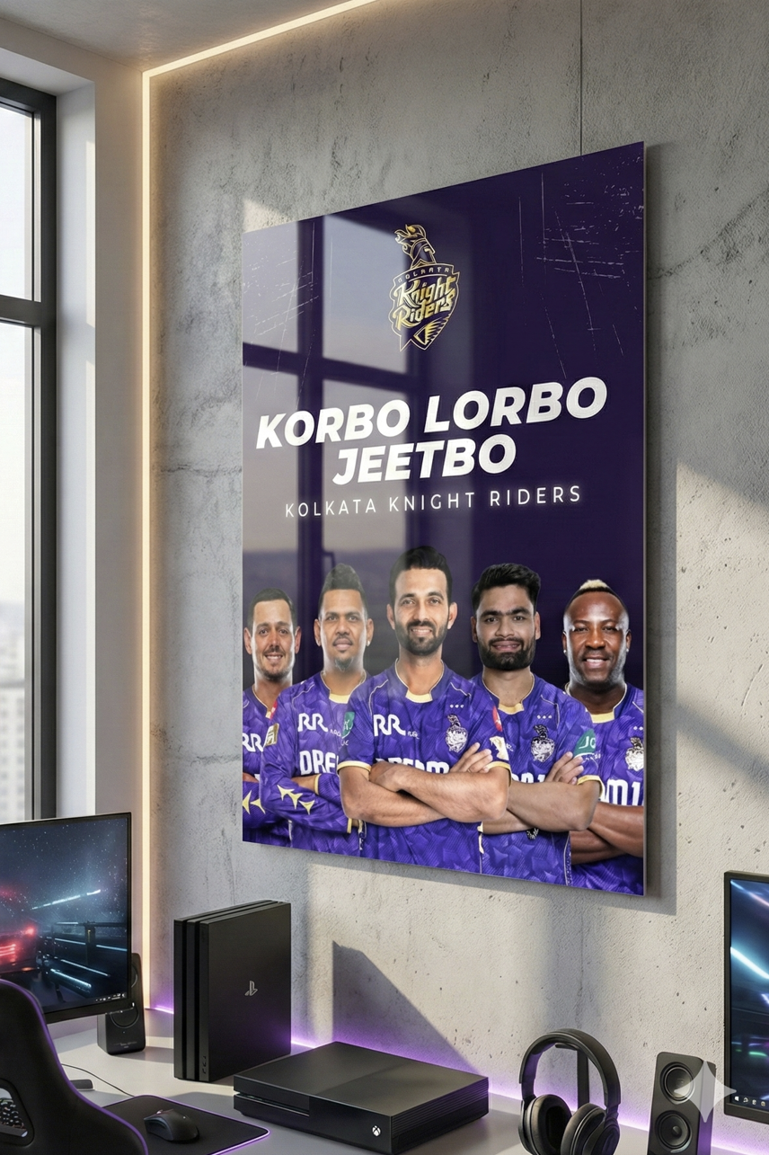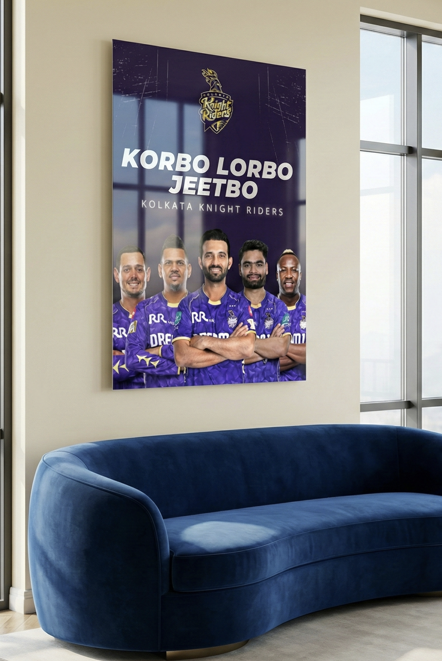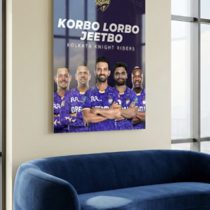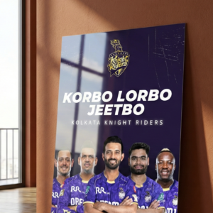 Bring home the fearless spirit of Kolkata Knight Riders with this bold “Korbo Lorbo Jeetbo” metal poster. Featuring the iconic KKR squad against a deep royal-purple backdrop, this artwork captures the fighting mindset and championship hunger of the Knight Riders.