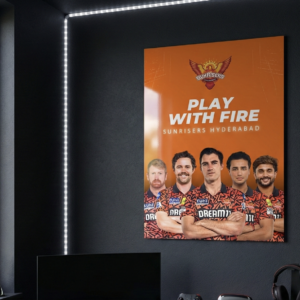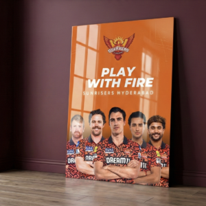 This high-energy metal poster celebrates the aggressive spirit of Sunrisers Hyderabad, captured under the iconic slogan “Play With Fire.” Featuring the core SRH squad in striking orange tones, this artwork is built for fans who thrive on intensity and attacking cricket.