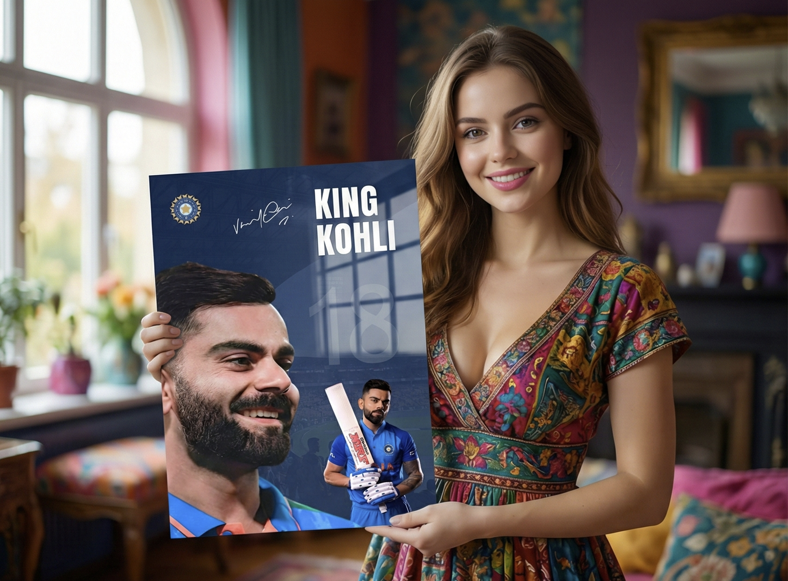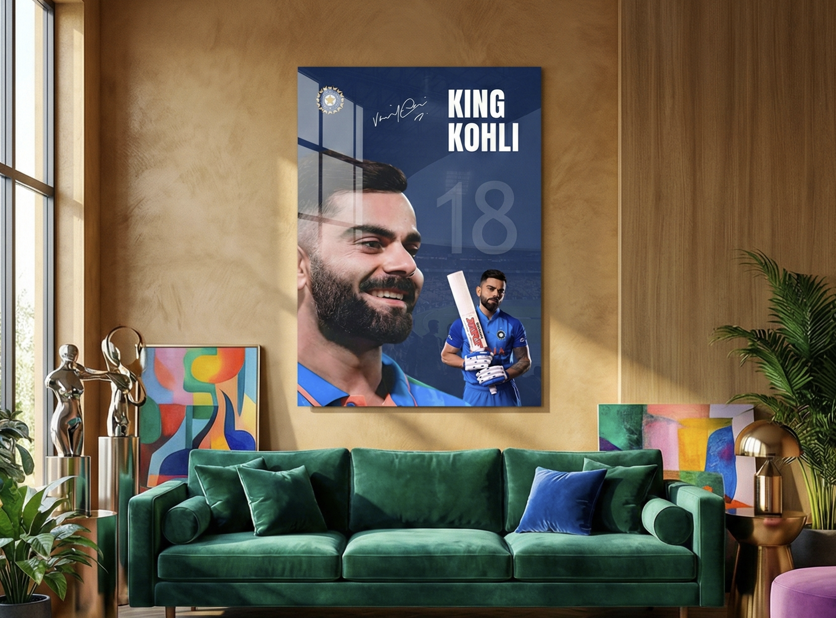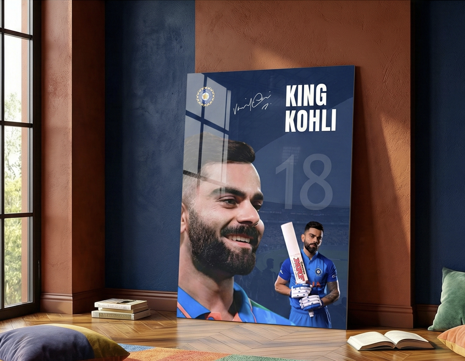 Celebrate the unmatched aura of Virat Kohli, the modern legend of world cricket. This powerful metal poster captures two sides of the King — the calm, smiling leader and the fierce batsman ready to dominate with the blade. Featuring the iconic No. 18, signature, and Indian blue jersey, this artwork is made for true fans of greatness.