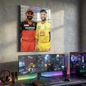A timeless frame featuring Kohli (RCB red) and Dhoni (CSK yellow)—rivalry, respect, and legends side by side.