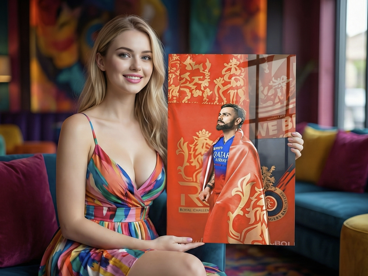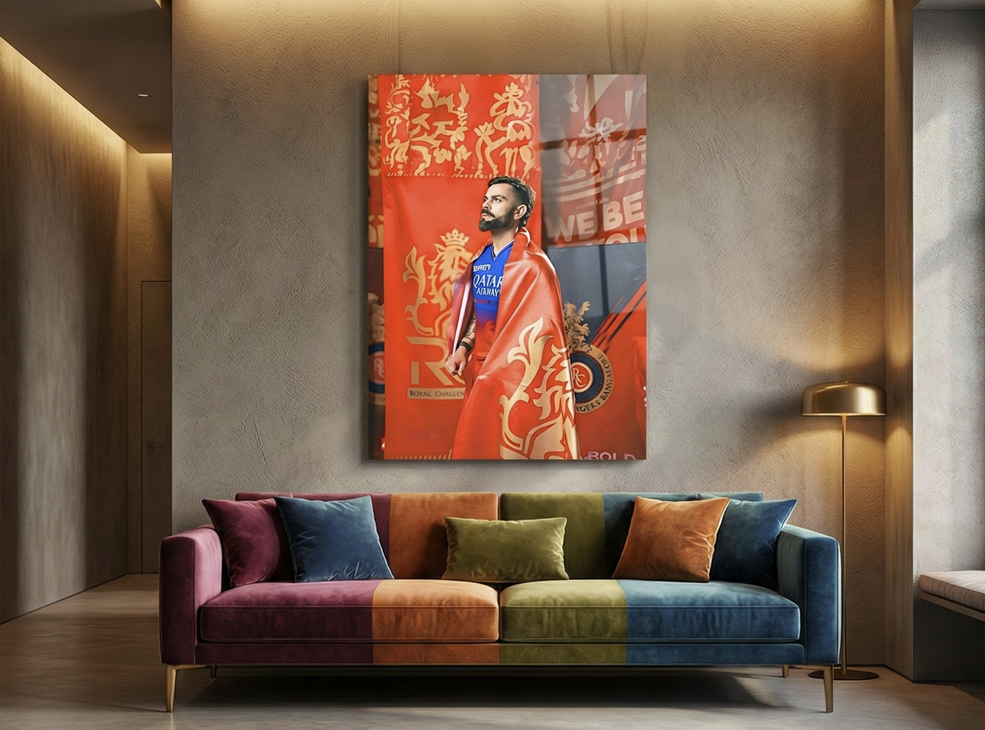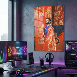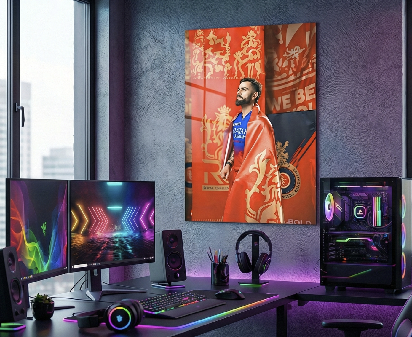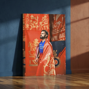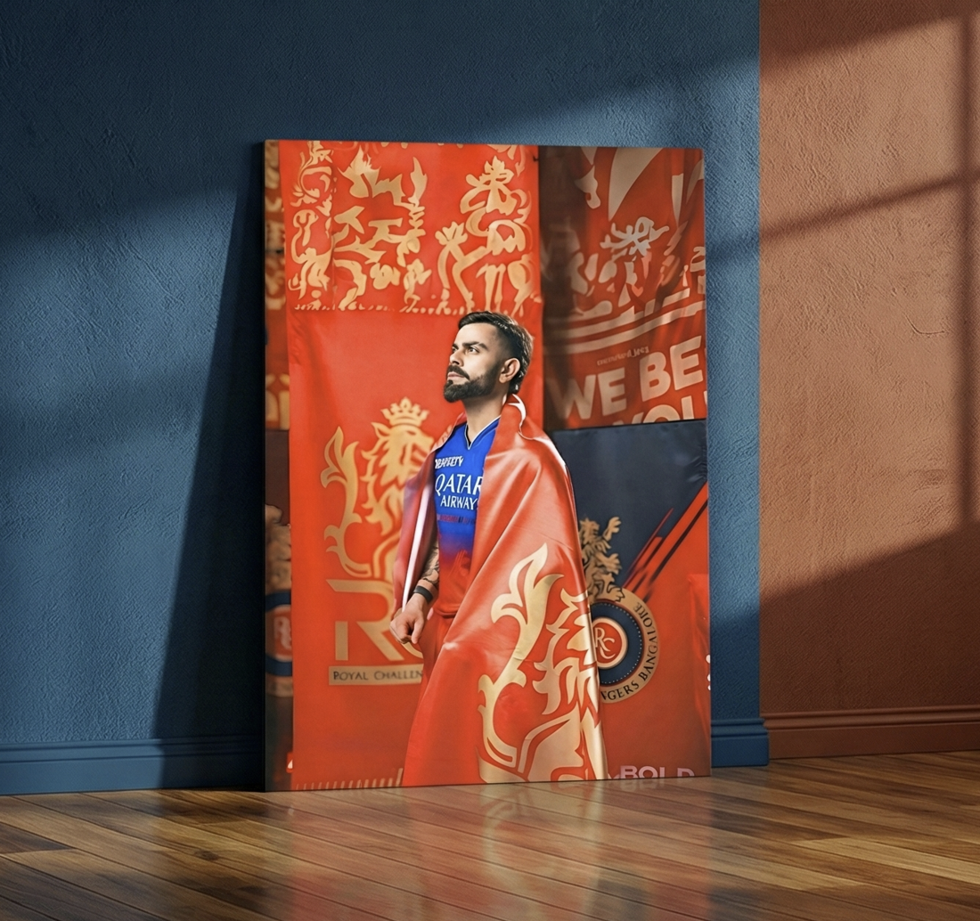 This iconic metal poster captures Virat Kohli standing tall in Royal Challengers Bengaluru colors, draped in the RCB flag like a true monarch of the game. With rich reds, golden lion motifs, and an intense, focused gaze, this artwork represents leadership, loyalty, and legacy.
