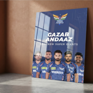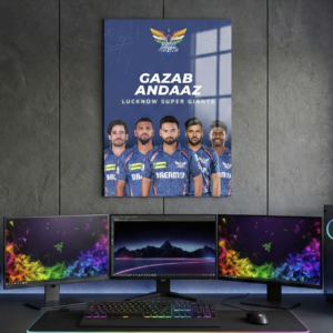 Celebrate the electrifying presence of Lucknow Super Giants with this striking “Gazab Andaaz” metal poster. Featuring the powerful LSG squad in their signature blue tones, this artwork perfectly captures confidence, unity, and modern IPL dominance.
