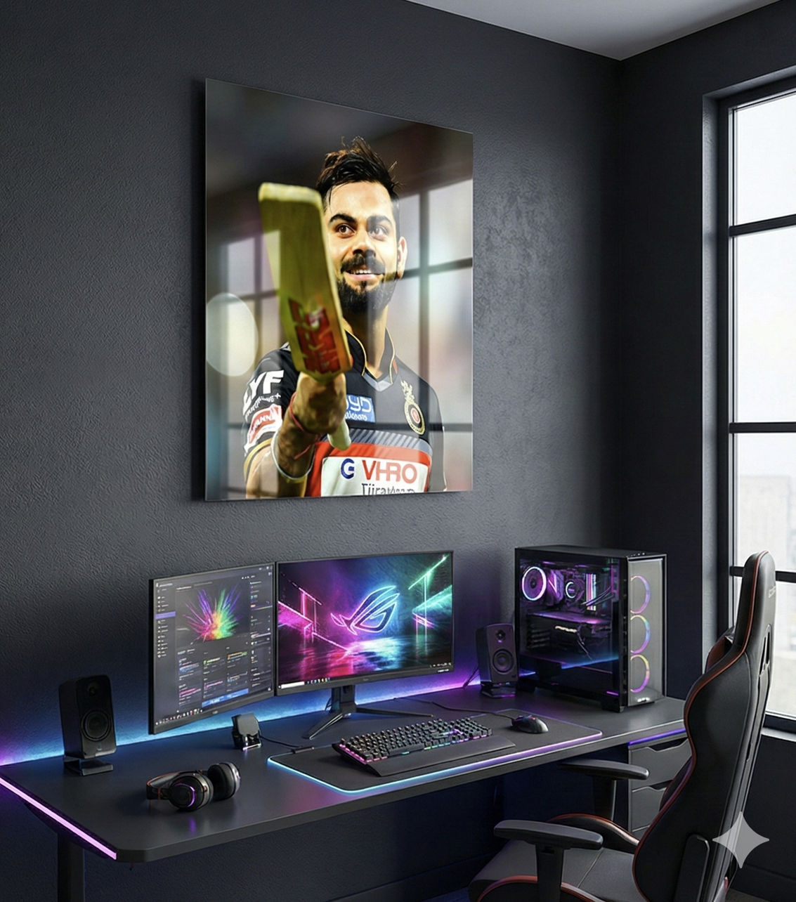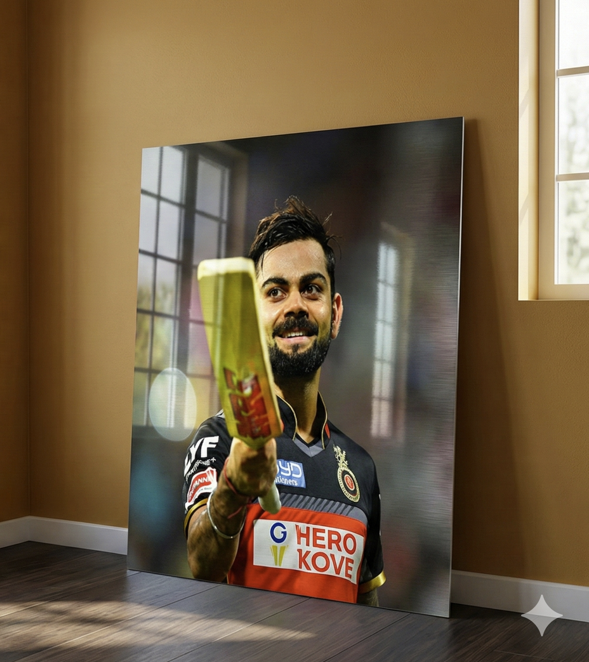 Bring the fire of modern cricket into your space with this electrifying Virat Kohli RCB Metal Poster. Capturing the King in action with bat raised, this design symbolizes dominance, passion, and relentless pursuit of victory — a must-have for every true cricket fan.
