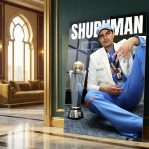 Celebrate calm confidence and championship class with this premium metal poster featuring Shubman Gill in a legendary post-victory moment. Captured with the ICC trophy and a relaxed champion’s pose, this artwork represents composure, success, and next-gen greatness—perfect for true cricket lovers.