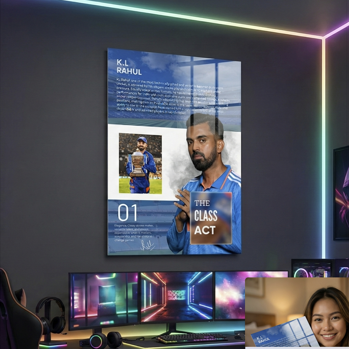 Featuring Rahul’s composed portrait alongside a trophy-winning moment—symbolizing class, consistency, and big-match performance.