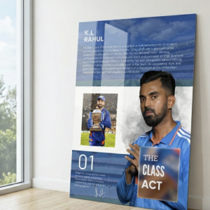 Grace, consistency, and modern-day mastery come together in this premium metal poster featuring K. L. Rahul—one of India’s most technically gifted and versatile batsmen. Designed for true cricket connoisseurs, this artwork reflects Rahul’s calm temperament, elegant stroke play, and unmatched adaptability across formats.