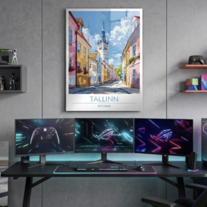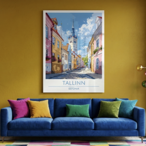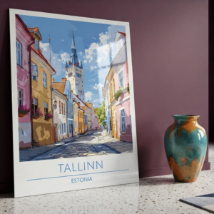 Bring the charm of Europe’s historic streets to your space with this stunning Tallinn travel metal poster. Featuring colorful old-town buildings, cobblestone streets, and the iconic medieval tower skyline, this artwork captures the timeless beauty of **Estonia’s capital in a vibrant, modern illustration style.