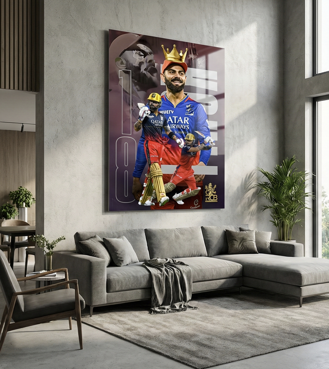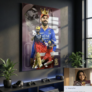 This premium metal poster celebrates Virat Kohli in his iconic Royal Challengers Bangalore avatar—crowned as the undisputed king of intensity and consistency. Featuring a bold multi-action composition with Kohli in full flow, this artwork captures the fearless spirit, leadership, and unmatched hunger that define his RCB legacy.