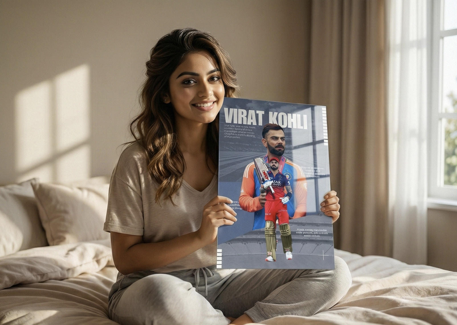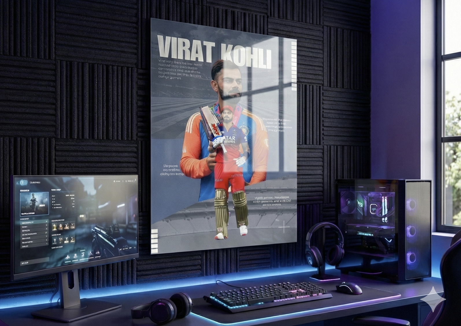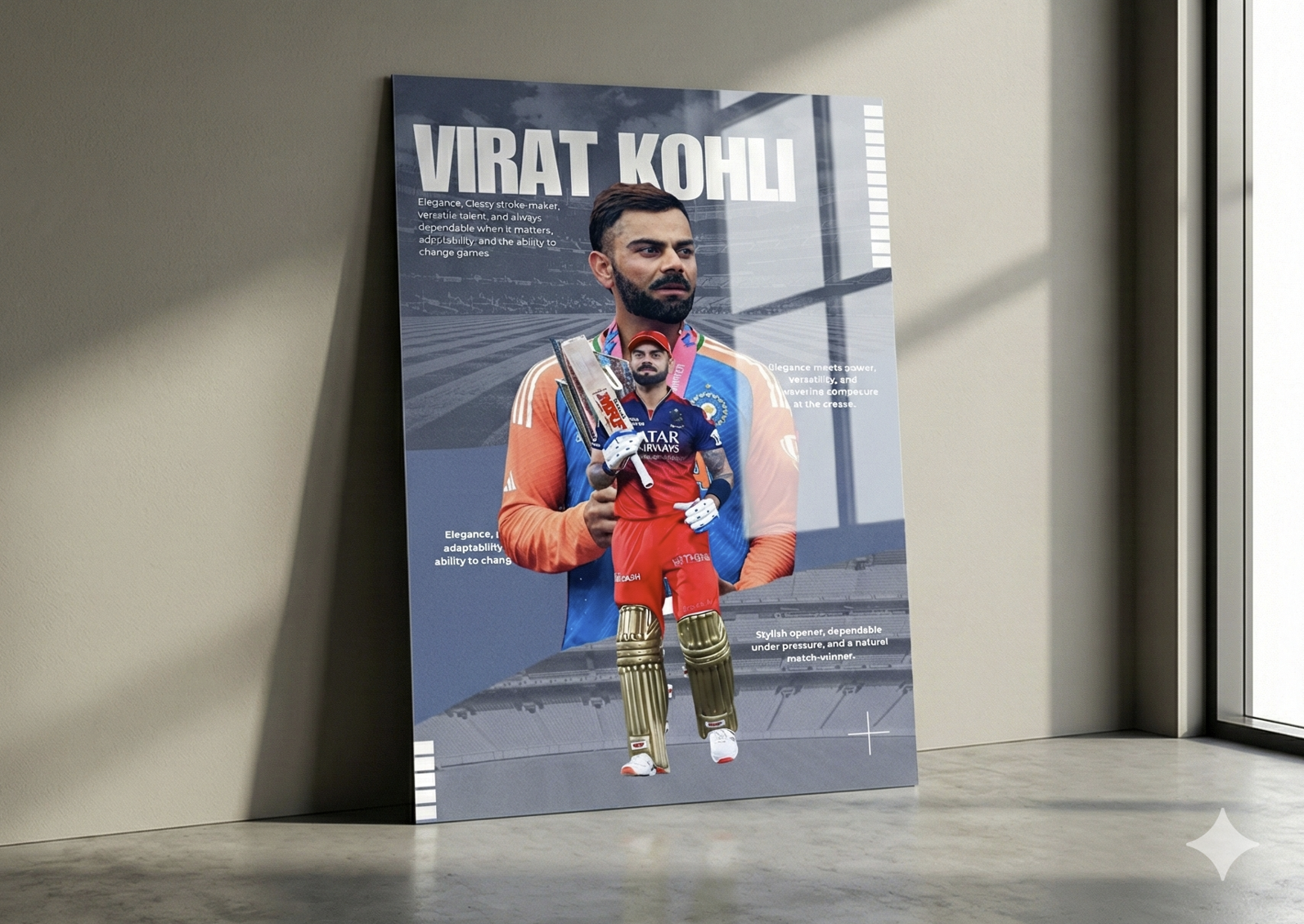 This premium metal poster celebrates Virat Kohli in a striking dual-visual composition—blending composure with aggression, legacy with modern dominance. Featuring Kohli in iconic Indian blue alongside his fearless red-kit form, this artwork captures the essence of a champion who adapts, endures, and delivers when it matters most.