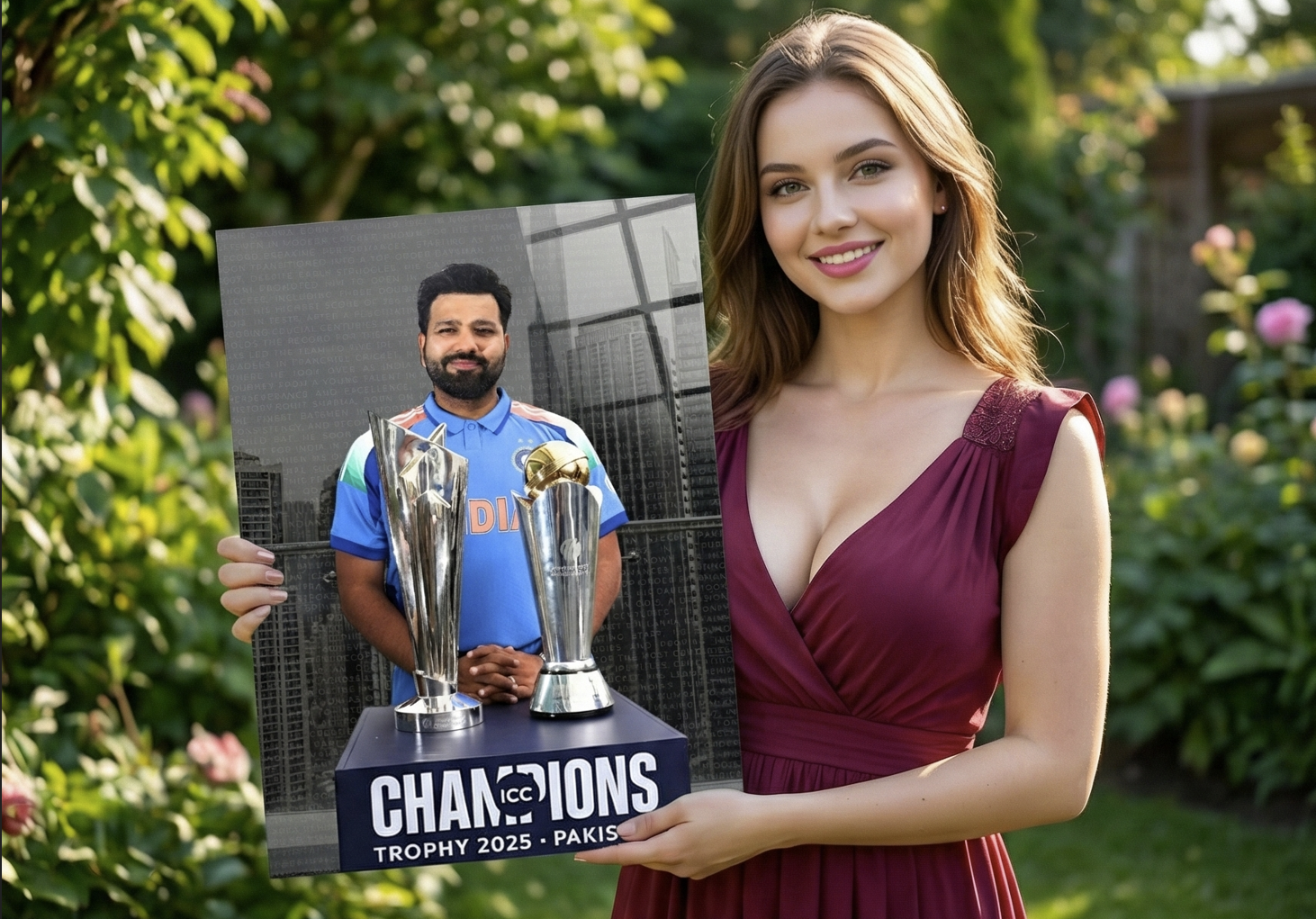 Rohit Sharma standing tall with ICC trophies symbolizes dominance, leadership, and historic achievement. -